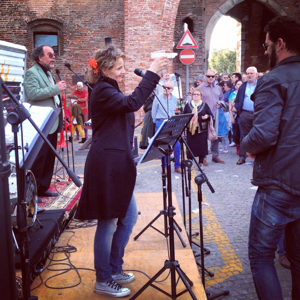 La bellissima interpretazione della cantante noalese della Santafè Band con la sua voce fantastica che risuonava sotto la Torre delle Campane. Insomma un pienone di divertimento, fantasia e fiori.