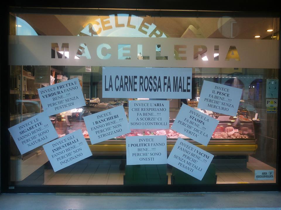 Dopo l’allarme lanciato dall’Organizzazione Mondiale della Sanità, questa è la risposta di un macellaio di Scorzè, Mauro Bortolato, 49 anni che abita a Rio San Martino e che ha deciso di tappezzare la vetrina del suo negozio di via Venezia con cartelli con scritto cosa fa veramente male.