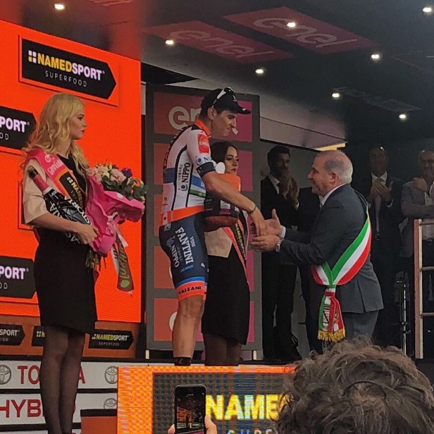 Il signore che vedete in foto, quello completamente a sinistra, tale Bruno Carraro, ha lottato anni per portare l’arrivo di una tappa del Giro qui. E alla fine c’è riuscito! Eccome se c’è riuscito. E oggi, oggi il paese era invaso di gente, musica, giornalisti, Tv, televisioni, conferenze stampa, interviste, dichiarazioni dell’ultima ora, elicotteri in sorvolo. Poliziotti spianati. Tutta Italia oggi collegata ha visto l’arrivo della 18 esima tappa. Riprese dall’alto, inquadrature, cameraman. E poi, poi le autorità il sindaco di Santa Maria di Sala Nicola Fragomeni che arriva sgargiante e sorridente come non mai. Il Governatore del Veneto Luca Zaia, che perfino i bambini lo fermano per strada per chiedergli un selfie. “Guarda guarda quello è il presidente del Veneto – fa un bimbo – io voglio una foto! Papà aspetta la foto con Zaia!”. E poi il sindaco della Città Metropolitana Luigi Brugnaro che saluta tutti. Tutti camminano trionfanti verso il palco. Dietro sta il codazzo di fotografi, addetti stampa, collaboratori, portavoce, guardie del corpo. Si corre a più non posso. Perché manca poco. Manca poco a questo arrivo così tanto atteso da anni. E allora ci si comincia a tenere in contatto. Con chi controlla la gara dall’altra parte. Mancano 60 chilometri. Mancano 20 chilometri. Mancano 10 chilometri. I messaggi su whatsapp iniziano ad arrivare. Sono a Moniego. Sono a Noale. Manca poco. Massanzago. San Dono. Manca poco. 450 metri. La musica che va. Lo speaker che parla. Italiano. Inglese. Duecento metri all’arrivo. I politici schierati sul palco. I fotografi in prima linea. La macchina di “inizio corsa” in lontananza. Le bandierine che sventolano. La polizia che avanza. Le sirene. I lampeggianti gialli. La gente che inizia ad animarsi. A farsi strada, a guardare, ad aguzzare la vista. Le motociclette che arrivano. Sorpassano il traguardo. Tutto è ripreso dai maxi schermi su sfondo rosa. Tutta Italia sta guardando. Le ammiraglie che arrivano. Lo scatto. La volata finale. Mancano solo loro. Gli atleti. La gente che inizia a fare il tifo. E poi lui. Il primo, Damiano Cima, che taglia il traguardo in un crescendo di energia! E allora sì! Santa Maria di Sala c’è! Santa Maria di Sala oggi più che mai!