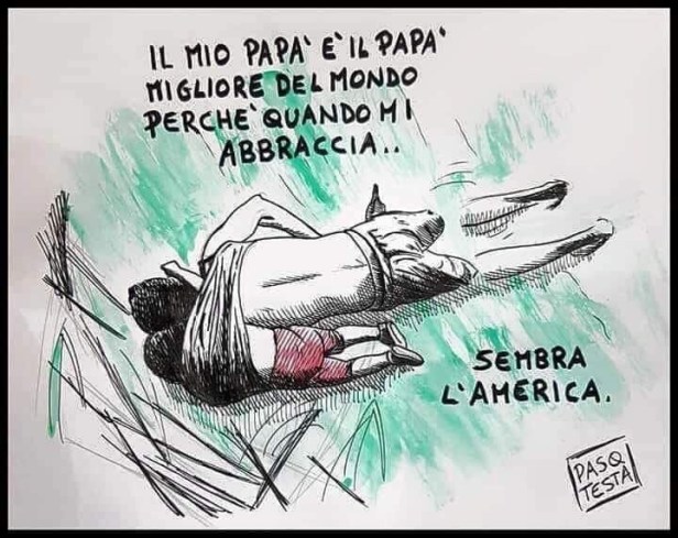A me non piace questa vignetta. Non mi piace no. Voi che continuate a postarla con il vostro sadismo che vi scorre nelle vene. A me non piace che qualcuno usi l’immagine di un padre che abbraccia una figlia. Anzi di una figlia che abbraccia il padre per provare a impietosire. Per provare a dire che siamo delle merde. L’anno scorso sul ponte di Genova sono morte 43 persone. Siamo delle merde sì. Siamo delle merde umane. E allora non mi piace no. Non mi piace che tutto il mondo posta le foto con il culo poggiato sulla sedia e poi. Poi rimane a guardare. Non mi piace che tutti si dicono indignati. E poi un campo di accoglienza non l’hanno visto nemmeno in fotografia. Non mi piace no. Non mi piace che tutti si riempiono di belle parole. Di frasi fatte. Di costruzioni a forma di cuore. Di offese. Di improperie solo per provare a dire quanto il genere umano sia una merda. Lo sappiamo. Lo sapete. E dentro alla merda ci siete compresi tutti. E non mi piace no. Non mi piace chi parla parla parla e poi posta una foto su Facebook e commenta. Non mi piace no. Andate. Andate. Andate a parlare con queste persone. Guardatele negli occhi. Stringete loro la mano. L’altro giorno a Venezia ho conosciuto una ragazza dell’Honduras fatalità e uno di questi giorni vi racconterò di questa ragazza dell’Honduras. Io ci ho parlato per mezz’ora. Ci ho speso tempo e sarei rimasta in sua compagnia ancora. E allora abbiate il coraggio per un giorno di togliervi la vostra comodità con i vostri culi al caldo o al freddo a seconda della stagione e provare a sporcarvi delle storie degli altri. Provate. Provate per un giorno a dimenticare chi siete. A dimenticare cosa avete. A dimenticare da dove venite. Perché è sempre molto comodo. È sempre molto comodo schierarsi da una parte o da un’altra. È sempre molto comodo posare il culo, con l’aria condizionata che ti sbatte nelle palle e scrivere che non siamo umani. Che siamo delle bestie. Che siamo animali. Partite. Andate. Andate a dare una mano. Aiutate. Entrate per un giorno soltanto in un centro accoglienza e respirate il profumo dei soldi che arrivano a palate quando si parla di profughi. La Caritas. La Caritas. La Caritas, quest’anno a Treviso, siccome il bando non prevedeva servizi e siccome la quota a migrante era diminuita, ecco la Caritas non ha partecipato al bando. E ha lasciato. Ha deciso. Ha deciso di lasciare che altri 100 e passa migranti tornassero nelle caserme. Allora andateci nelle caserme. Andateci. Io ci sono stata nelle caserme. E tra poco, a settembre, uscirà anche un libro. E vi posso assicurare che non basta dire accoglienza per farla. Andate nelle caserme dove d’estate ci sono 40 gradi e la puzza di fogna e di piscio fuoriesce dalla terra. Andate nelle caserme dove i migranti dormivano (dormono) accatastati sopra materassi di legno legati tra loro con il filo di ferro. Andate. Andate nelle caserme con l’acqua putrida che ti corre accanto mentre fai il bagno. Andate nelle caserme dove sotto un tendone dormono in 300 e fanno la fila anche per pisciare. Andate nelle caserme dove le cooperative dovevano insegnare l’italiano e parli con i migranti e non capiscono mezza parola. E andate nelle caserme dove fino a pochi mesi fa c’erano persone che attendevano un permesso da anni. Senza futuro. Senza speranza. Senza nemmeno immaginazione. Cadaveri che camminano erano. Sono. Fantasmi in attesa di un posto nel mondo. Burattini nelle mani di chi con loro volendoli accogliere ci ha fatto il soldi a palate. E allora andate. Andate. Andate. Ma per favore. Per favore. Le foto lasciatele ai giornalisti. Ai fotografi. Lasciatele ai mezzi d’informazione per togliervi dalla vostra becera ignoranza. Non usatele per far impietosire il mondo. Per avere un pugno di like. Perché allora avrete fatto lo stesso errore. Quello di far parte di un mondo di merda.