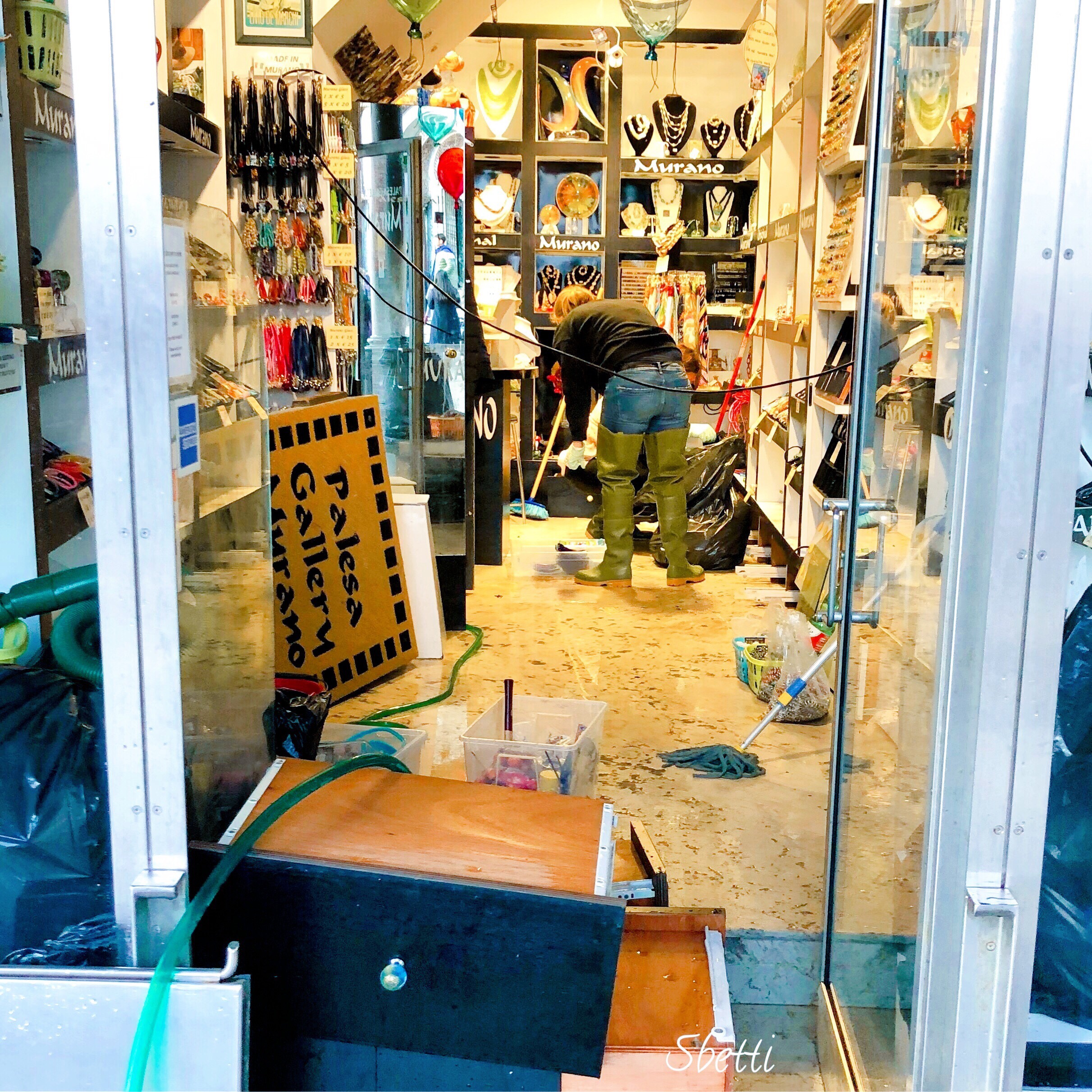 E questi giorni ho visto la gente non mangiare. Non dormire. Non avere l’acqua nemmeno per lavarsi i denti. Ho visto le donne che mi hanno detto “ho i capelli sporchi”, ho visto gli uomini in tuta pieni di freddo. I muscoli congelati. Ho visto le donne rannicchiate. Le mani congelate. Con i giubbotti dentro ai negozi. Ho visto i titolari e i negozianti bestemmiare. I facchini imprecare. Cercare di salvare il recuperabile. Ho visto la gente spazzare via l’acqua. Correre con gli enormi sacchi di spazzatura. Ho visto le persone non poter andare in bagno. Non poter fare un caffè. Non potersi scaldare. Ho visto persone asciugare i frigoriferi con il phon, buttare frigoriferi. Buttare freezer. Ho visto anche chi asciugava i libri con il phon. Ho visto proprietari che mandavano fuori dal proprio locale i clienti e in solidarietà li mandavano in quello accanto. Perché funzionava. Perché anche con le porte aperte potevi trovare un attimo di caldo. E poi. Poi ho visto gente disperata, accucciata, guanti in mano, scopettoni, stesa a terra a lavare il pavimento. Ho visto gente risollevare i manichini, spazzati via dalla furia dell’acqua e del vento. Ho visto gente pulire le piastrelle. Disinfettarle, lucidarle. Una a una. Ho visto persone oltraggiare lo Stato, il Governo, compagnia cantante, per questa Venezia lasciata a sé stessa. Ma soprattutto. Sopratutto ho visto una Venezia lavorare. Rimboccarsi le maniche. Darsi da fare. Ho visto le persone correre. Indaffarate. Affaccendate. Persone prendere la pala, tirare su la melma, riempire secchi di roba, togliere la roba marcia e aprire i sacchetti e gettarla.