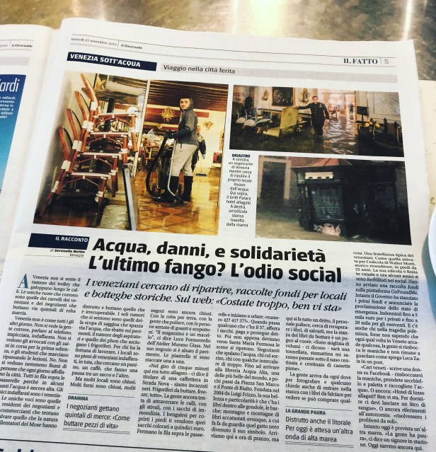 Venezia stamattina non è come tutte le altre mattine. Non si vede la gente correre, parlare al telefono, impicciata, indaffarata. Non si vedono gli avvocati con gli zaini in corsa per la prima udienza, o gli studenti che marciano ripassando le lezioni. No. Non si vedono nemmeno fiumi di persone che ogni giorno affollano la città. Tutti in fila sopra le passerelle perché in alcuni punti l’acqua è ancora alta. Gli unici indaffarati sono i veneziani. Le uniche voci sono quelle dei residenti dei negozianti e dei commercianti che tentano di salvare quello che la natura e i rallentatori del Mose hanno distrutto e buttano quello che è irrecuperabile. I soli rumori che si sentono sono quelli della scopa di saggina che spazza via l’acqua, che sbatte sui pavimenti, il rumore degli aspiratori e quello dei phon che asciugano i frigoriferi. Per chi ha la fortuna di lavorare, i locali sono pieni, pieni di veneziani indaffarati, in tuta, che cercano un panino, un caffè, che fanno una pausa tra un sacco e l’altro.