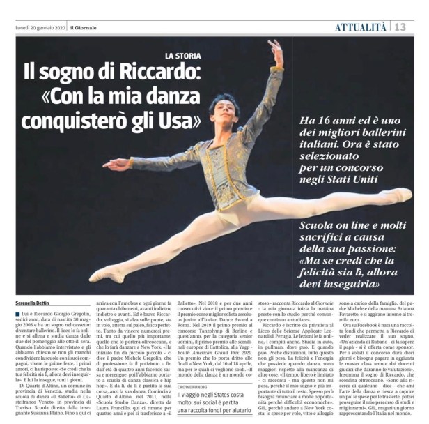 Ha vinto vari premi e competizioni e ora vola a New York. Ma per andare a New York ci vogliono soldi. Le spese per il volo, vitto e alloggio sono a carico della famiglia. Il padre Michele Gregolin cerca qualche sponsor. E Riccardo qualcuno che ami il mondo della danza, anzi l’arte, e che lo possa sostenere nelle sue trasferte.