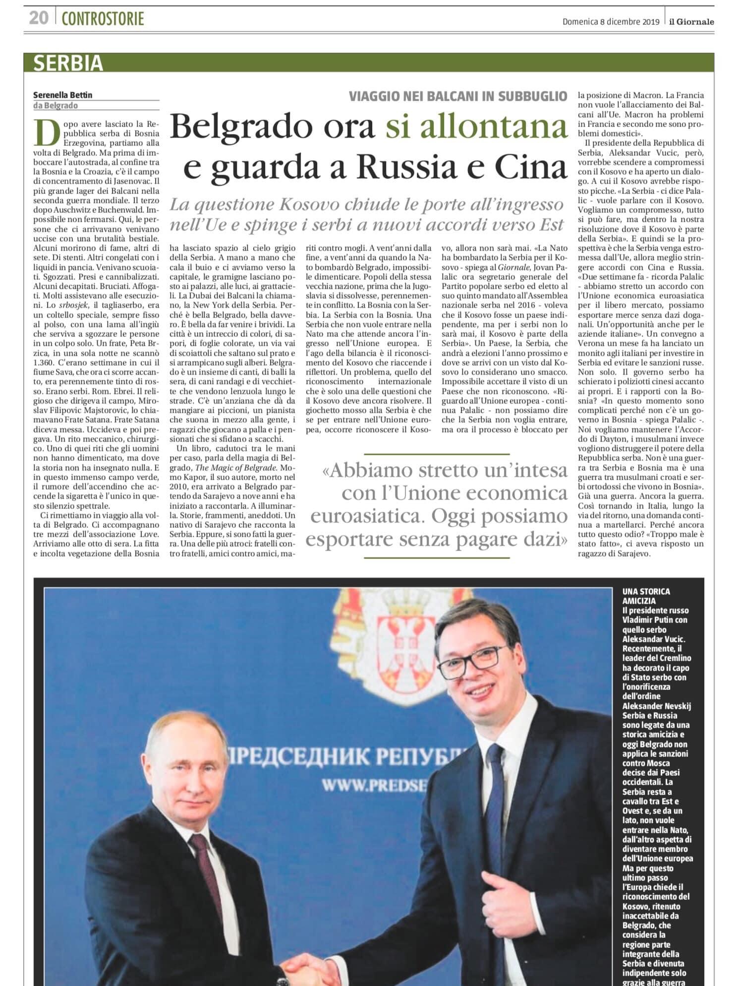 Il presidente della Repubblica di Serbia, Aleksandar Vucic, però, vorrebbe scendere a compromessi con il Kosovo e ha aperto un dialogo. A cui il Kosovo avrebbe risposto picche. «La Serbia – ci dice Palalic – vuole parlare con il Kosovo. Vogliamo un compromesso, tutto si può fare, ma dentro la nostra risoluzione dove il Kosovo è parte della Serbia». E quindi se la prospettiva è che la Serbia venga estromessa dall’Ue, allora meglio stringere accordi con Cina e Russia. «Due settimane fa – ricorda Palalic – abbiamo stretto un accordo con l’Unione economica euroasiatica per il libero mercato, possiamo esportare merce senza dazi doganali. Un’opportunità anche per le aziende italiane». Un convegno a Verona un mese fa ha lanciato un monito agli italiani per investire in Serbia ed evitare le sanzioni russe. Non solo. Il governo serbo ha schierato i poliziotti cinesi accanto ai propri. E i rapporti con la Bosnia? «In questo momento sono complicati perché non c’è un governo in Bosnia – spiega Palalic -. Noi vogliamo mantenere l’Accordo di Dayton, i musulmani invece vogliono distruggere il potere della Repubblica serba. Non è una guerra tra Serbia e Bosnia ma è una guerra tra musulmani croati e serbi ortodossi che vivono in Bosnia». Già una guerra. Ancora la guerra. Così tornando in Italia, lungo la via del ritorno, una domanda continua a martellarci. Perché ancora tutto questo odio? «Troppo male è stato fatto», ci aveva risposto un ragazzo di Sarajevo.