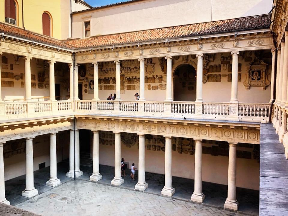 Nel cortile ci sono l’Aula degli Studenti e quella delle Studentesse. In genere in quella delle Studentesse ci finivano solo le femmine. In quella degli studenti ci finivano entrambi. La donna andava sempre dai maschi. Sulla struttura in alto che si affaccia sul Cortile Nuovo e che racchiude la “Sala del Collegio Accademico”, ci sta un altorilievo in travertino di Attilio Selva, del 1939, che rappresenta la goliardia padovana e riflette i caratteri apologetici del nazionalismo fascista. Anzi. Sul Cortile Nuovo c’è anche un’iscrizione dedicata a Mussolini.