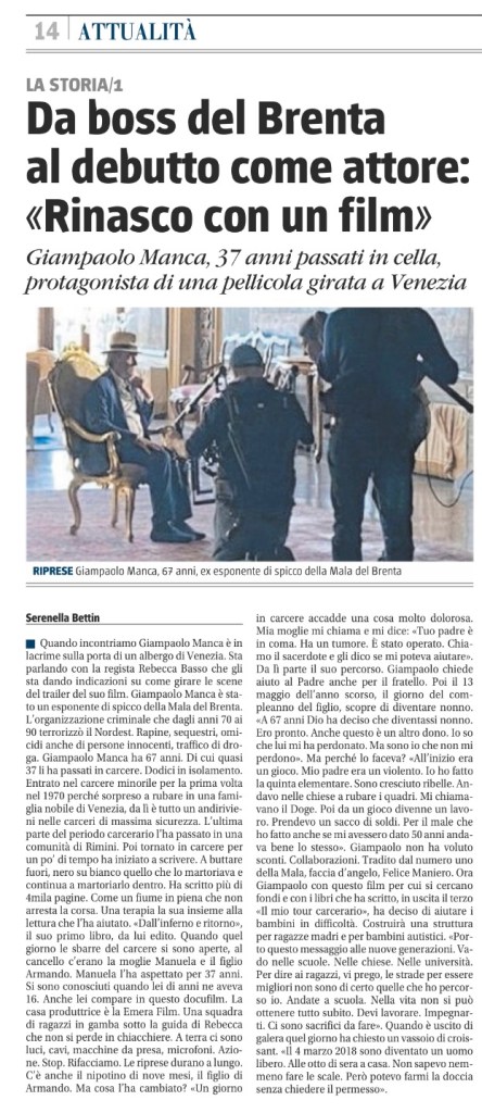 Quando arrivo e faccio la scalinata che mi conduce di sopra nella sala dell’hotel, Giampaolo Manca sta girando una scena. Una scena dolorosa. La Mala del Brenta è quella organizzazione criminale che negli anni 70 e 90 ha terrorizzato tutto il Nordest. Crimini, furti, rapine, omicidi, traffico di sostanze stupefacenti.