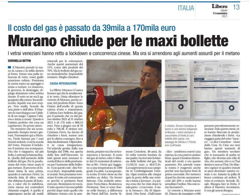Il Maestro prende in mano la canna e la infila dentro al forno. Estrae una palla infuocata di vetro, rosso giallo arancione rubino. Posiziona la canna sopra un appoggio e inizia a ruotare. La manovra, la governa, la destreggia, dipinge sfumature color ambra dorate. Il vetro se ne sta lì aggrappato alla canna. Incandescente, liquido ma non troppo. Non molla. Scende da una parte e dall’altra. Il Maestro lo riacchiappa con l’abilità di un mago. Capisce l’attimo e inizia a creare. Questo è l’attimo perfetto che crea un capolavoro. Un pezzo unico. Un mestiere che sta scomparendo. Sempre meno i giovani. Nonostante qui a Murano, l’isola famosa per i suoi tizzoni ardenti, ci sia la scuola del Vetro. Durante il lockdown il turismo era scomparso. Ora che è riapparso, sul più bello, è arrivata la batosta finale. Quella dell’aumento delle bollette del gas. Per la produzione del vetro viene usato il gas metano. Il processo di fusione inizia la sera prima. Alla sera si caricano i forni. La miscela fatta di silice, soda che abbassa il punto di fusione, e calce che lo stabilizza, viene messa nei contenitori chiamati crogioli. A quella si aggiungono anche gli ossidi minerali per le colorazioni. Anche questi aumentati del 15%, come altri prodotti del 70%. Ma le bollette del gas sono stratosferiche. Impossibile resistere. Meglio chiudere. La Effetre Murano è l’unica fornace qui che fa semilavorati in vetro. Ossia rifornisce le vetrerie di Murano, poche ormai, del prodotto finito. Sono l’inizio dell’anello di questa catena d’arte e maestranza. L’ultima loro bolletta del gas, per il periodo che va dal primo ottobre 2021 al 31 ottobre 2021 è di 170 mila e 860,16 euro. Fino a giugno era di 39 mila e 706,38. Il titolare ieri, Cristiano Ferro, ha deciso di chiudere i forni, tranne uno per le ultime consegne, fino a data da destinarsi. I dipendenti in cassa integrazione. Un’azienda gestita dalla sua famiglia dal 1996, ma aperta dalla fine dell’Ottocento. In tutti questi anni nessuno ricorda il blocco della produzione per l’aumento delle bollette. “Con questi costi – dice Ferro a Libero – impossibile andare avanti. Non possiamo rovesciare il costo sul consumatore perché ci portiamo fuori mercato. Resistiamo tre mesi. E tutto questo è inconcepibile perché dopo tutto quello che abbiamo vissuto con la pandemia, proprio ora che si ricominciava a lavorare. Il costo del gas al metro cubo è slittato dai 23 centesimi di settembre ai 96”. I forni qui viaggiano a una temperatura di 1400 gradi. Fa caldo. La temperatura scotta. Il vetro viene su che sembra un dolce. Un lavoro faticoso. Che richiede attenzioni. Forza fisica. Resistenza. Prestanza. Non ci sono donne nelle fornaci, a differenza dei Paesi dell’Est. Anche Simone Cenedese, 48 anni, da 32 nella vetreria fondata da suo padre, ha ricevuto la batosta delle bollette del gas. Da 13.105,52 euro a 48.671,61. Lui rappresenta la sua categoria in Confartigianato Venezia. Ogni mattina alle cinque apre la porta della sua vetreria e inizia a lavorare. “La prima cosa che ho visto – ci racconta – dopo la sala parto è stata la fornace”. Ha 20 dipendenti. Otto forni. “Dall’estate – dice – sembrava esserci una ripresa, la cosa pareva andare bene, quasi ci fossimo dimenticati del covid, e ora questo aumento. Per aziende come la nostra è esagerato anche perché non facciamo beni di prima necessità. Per metterci al pari ho dovuto aumentare i costi del 20% e molti hanno annullato l’ordine. Ma così come facciamo?”. Le vetrerie a Murano sono 65. Danno da mangiare a 600 persone prevalentemente veneziane. Solo questo mese, otto hanno bloccato la produzione chiudendo i forni. “La maggior parte del vetro “tarocco” – ci dice Cenedese – viene dalla Cina. In Cina ora non hanno questi aumenti di gas”. Un mestiere secolare che si tramanda di padre in figlio, che diventa uno stile di vita, che annusi, che o ce l’hai dentro o non ce l’hai. Un Maestro capisce in quattro minuti se puoi diventare mastro vetraio o no. Intanto la palla di fuoco continua ad ardere. Il vetro si contorce. Scende. Risale. Bisogna fare in fretta. E allora il Maestro ricomincia. E con gli arnesi disegna.