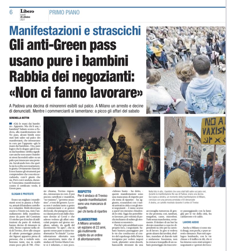 Giù le mani dai bambini”. Appunto. Ma chi li usa i bambini? Sabato scorso a Padova alla manifestazione dei no Pass, alcuni bimbi sono stati fatti salire sul palco dei manifestanti che intonavano in coro “giù le mani dai bambini”.