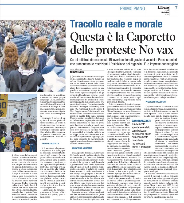 Anche a Milano ci sono stati disagi. Non pochi. E alla fine con le vie chiuse e il traffico in tilt, chi ci ha rimesso sono stati sempre i negozianti e i gestori dei locali. “Giù le mani dal lavoro”, gridavano i manifestanti imboccando corso Vittorio Emanuele, non capendo che proprio loro in quel momento bloccavano il guadagno di chi al sabato fa il 20% del fatturato. Ergo di chi anche al sabato porta a casa la pagnotta. In piazza c’erano 8 mila persone tra cui anche esponenti del gruppo Do.Ra., comunità militante dei Dodici Raggi di Varese ma anche esponenti dell’estrema sinistra. Ha sfilato anche l’ex brigatista, Paolo Maurizio Ferrari. Ma soprattutto ci sono stati denunce, segnalazioni e un arresto. La polizia ne ha identificati e denunciati nove del gruppo Do.Ra, emettendo nove fogli di via obbligatori dal comune di Milano. Dovranno rispondere di: apologia di fascismo, manifestazione non preavvisata, interruzione di pubblico ufficio e violenza privata. L’arresto è di un egiziano di 22 anni, già inutilmente colpito da un ordine di allontanamento e con numerosi precedenti a carico, e fermato per resistenza a pubblico ufficiale. Oltre a 40 persone identificate per “comportamenti insidiosi e violenti”. A Trieste invece la protesta si è sgonfiata. E al porto, questa bellissima conca sul Golfo, non c’è più nessuno. Se non gente che lavora, navi che arrivano, camion fermi ai varchi che caricano e scaricano, e una squadra della polizia che controlla e sorveglia. C’è anche un addetto alla viabilità che avviciniamo. Lui è uno di quelli no vax e no pass. “Non esiste. Io il vaccino a mio figlio non glielo faccio fare, ancora non ha 18 anni. E quando ne avrà 18 spero mi stia a sentire”.