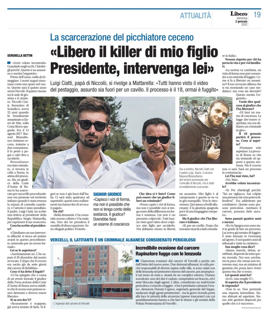 “Avrei voluto incontrarlo. Guardarlo negli occhi. Chiedergli perché. Questo è un assassino e merita l’ergastolo”. Primo dell’anno, nulla da festeggiare. I nostri auguri risuonano come uno sparo nel vuoto. Questo sarà il quinto anno senza Niccolò. Il quinto vissuto tra le aule di giustizia e il cimitero. Niccolò Ciatti, fiorentino di Scandicci, aveva 22 anni quando fu brutalmente assassinato a Lloret de Mar, sulla Costa Brava spagnola. Era il 12 agosto 2017. Rassoul Bissoultanov, lottatore ceceno, insieme a due connazionali lo pestò a pugni e calci fino a ucciderlo. Bissoultanov era stato estradato, si trovava in cella a Roma, in attesa del processoMa un giudice della Corte d’Assise di Roma lo ha scarcerato per un cavillo procedurale: non era presente sul territorio italiano quando è stata emessa la misura di custodia cautelare, e l’arresto è stato annullato. Il padre, Luigi Ciatti, ha scritto una lettera al presidente della Repubblica Sergio Mattarella, per esprimere il suo sconcerto.