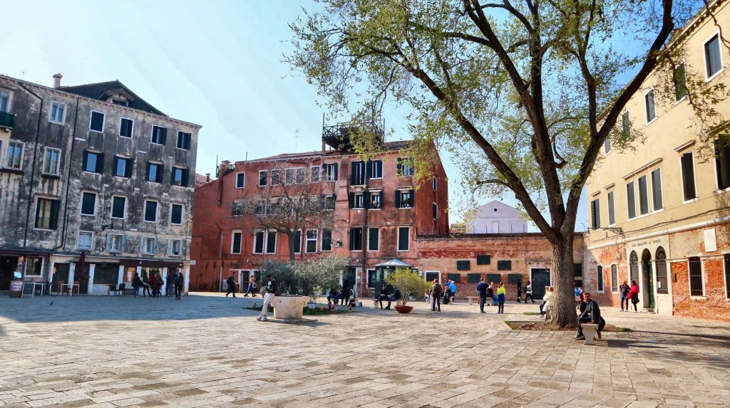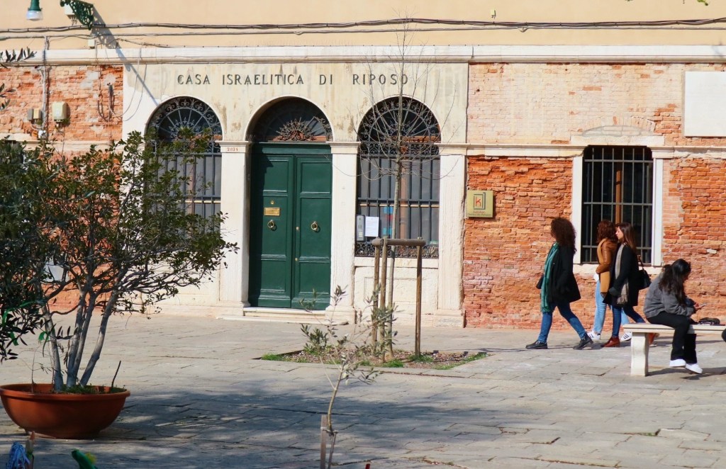 È qui in questo ghetto che vennero chiusi gli ebrei. Una piazza, Gheto Novo che è il più antico, circondata di palazzi tinti di giallo rosso e marrone alcuni ammuffiti altri candidi perfetti dove ancora ci stanno i balconi verdi aperti con la gente che si affaccia. Un luogo singolare. Antico. Un viaggio nel tempo. Dove la gente siede sulle panchine. Consuma qualcosa all’aperto. Dove davanti la Casa israelitica di riposo passeggiano i vecchi con la schiena ricurva e la kippah in testa. Dove la gente si saluta. Porta rispetto. Scatta qualche foto. Dove sotto i capitelli di quei palazzi tinti di giallo rosso e marrone alcuni arrugginiti altri ammuffiti altri candidi perfetti ci stanno i bambini che giocano a nascondino con i genitori. Dove ci stanno le stampe piene di gatti Veneziani. Un lavacro. Una sorta di bagno nella pace. Poi oltrepassato il ponte riprende la via dei localini, cicchetti Veneziani, dove la gente si stende al sole…