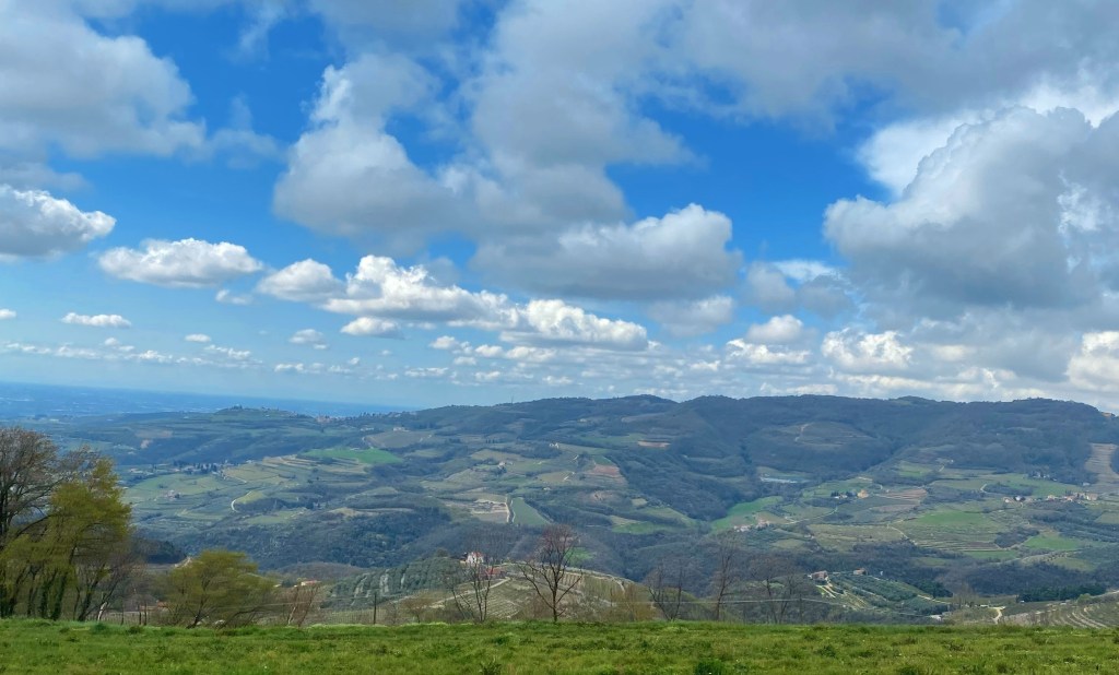 Il paesaggio è quello tipico delle Prealpi, ampie dorsali, conche e vallette, tratteggiate e addobbate da prati e pascoli; aggrappati alle braccia delle montagne poi ci stanno boschi di carpino, faggio, abete rosso. Il vecchietto con l’ape porta a spasso la legna. La consegna avviene casa per casa. Via per via. Già ci stanno le consegne per l’anno prossimo. Tanta gente con la guerra in atto si sta attrezzando per scaldarsi con pellette e legname. Ma tanto si fa fatica a recuperare pure questo. Poi si torna giù. La benzina qui sta bassa. Faccio il pieno. Mi viene fame. E mi fermo a Soave. Soave è un altro gioiello incastonato tra le colline. Vedo quel pennone del nostro tricolore issato che svetta sulla Rocca. Ondeggia. Sventola. Non molla.