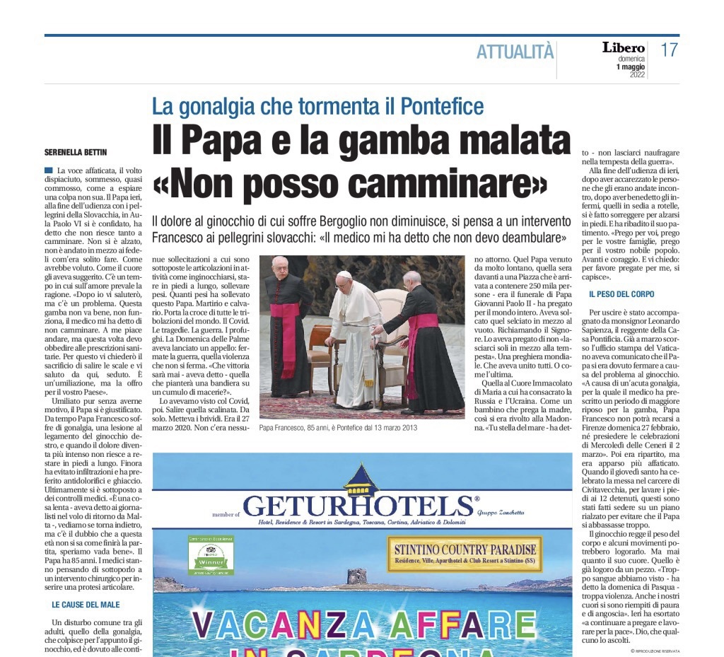 Umiliato pur senza averne motivo, il Papa si è giustificato. Da tempo Papa Francesco soffre di gonalgia, una lesione al legamento del ginocchio destro, e quando il dolore diventa più intenso non riesce a restare in piedi a lungo. Finora ha evitato infiltrazioni e ha preferito antidolorifici e ghiaccio. Ultimamente si è sottoposto a dei controlli medici. “È una cosa lenta – aveva detto ai giornalisti nel volo di ritorno da Malta – vediamo se torna indietro, ma c’è il dubbio che a questa età non si sa come finirà la partita, speriamo vada bene”. Il Papa ha 84 anni. I medici stanno pensando di sottoporlo a un intervento chirurgico per inserire una protesi articolare.