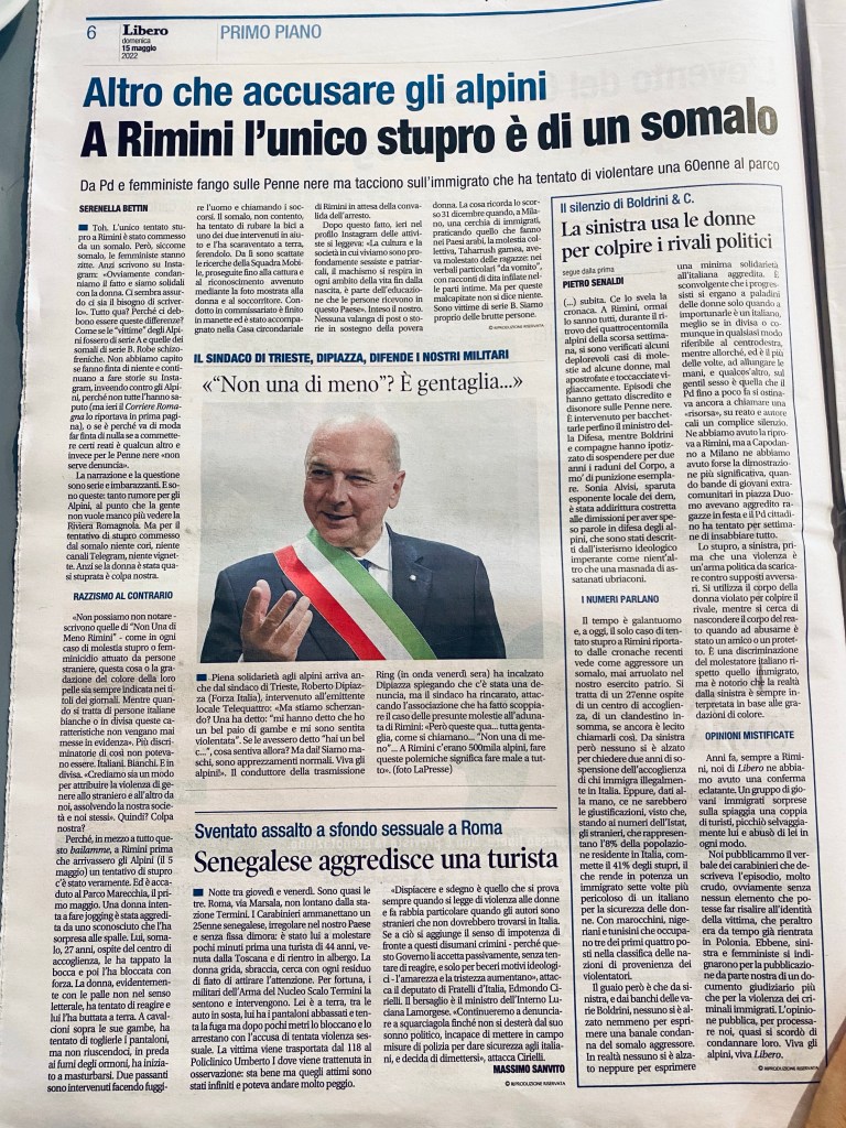 Toh. L’unico tentato stupro a Rimini è stato commesso da un somalo. Però, siccome somalo appunto, le femministe se ne stanno zitte. Anzi scrivono su Instagram: “Ovviamente condanniamo il fatto e siamo solidali con la donna. Ci sembra assurdo ci sia il bisogno di scriverlo”. Tutto qua? Perché ci devono essere queste differenze? Come se le “vittime” degli Alpini fossero di serie A. E quelle dei somali fossero di serie B. Robe schizofreniche.