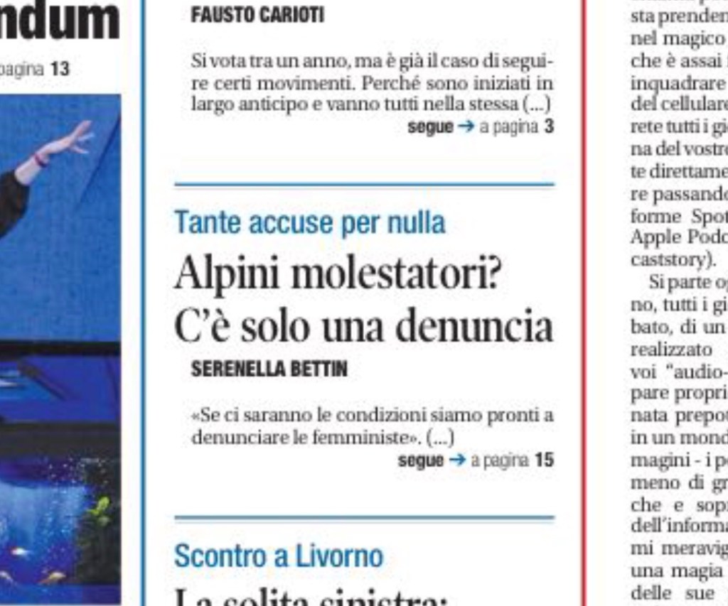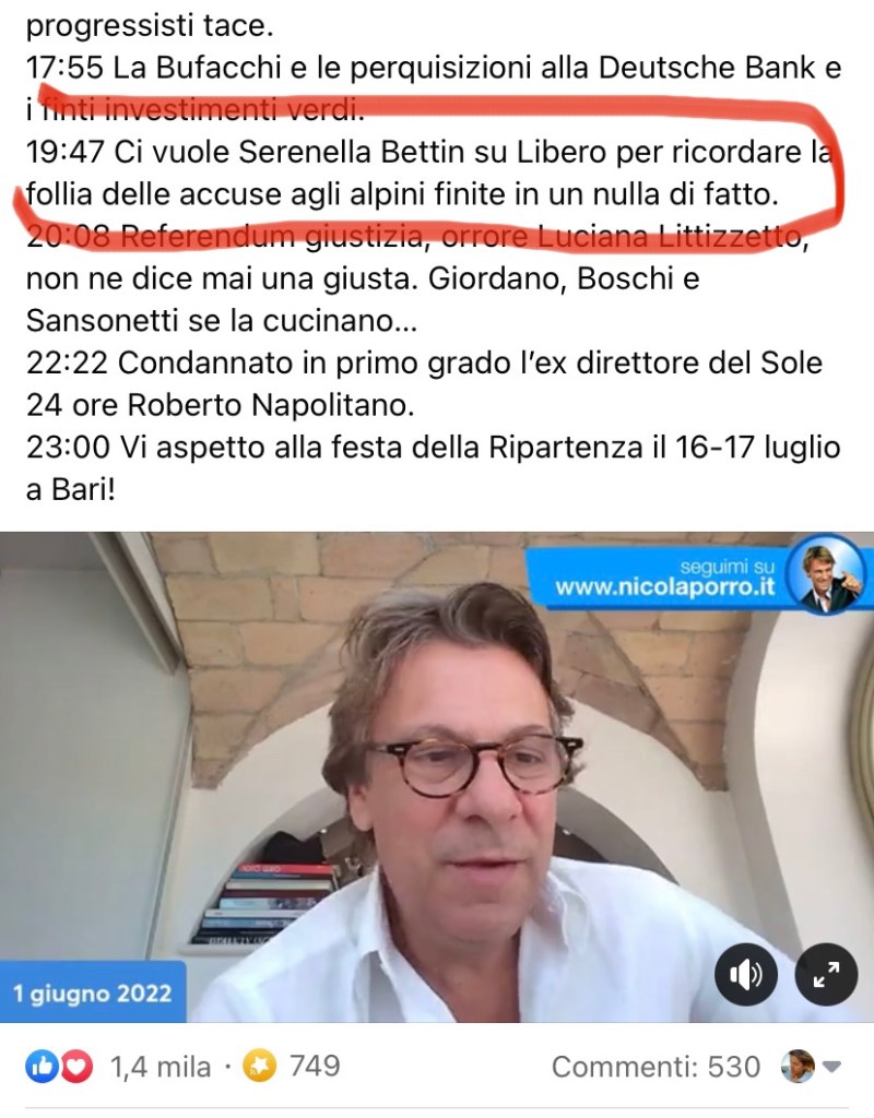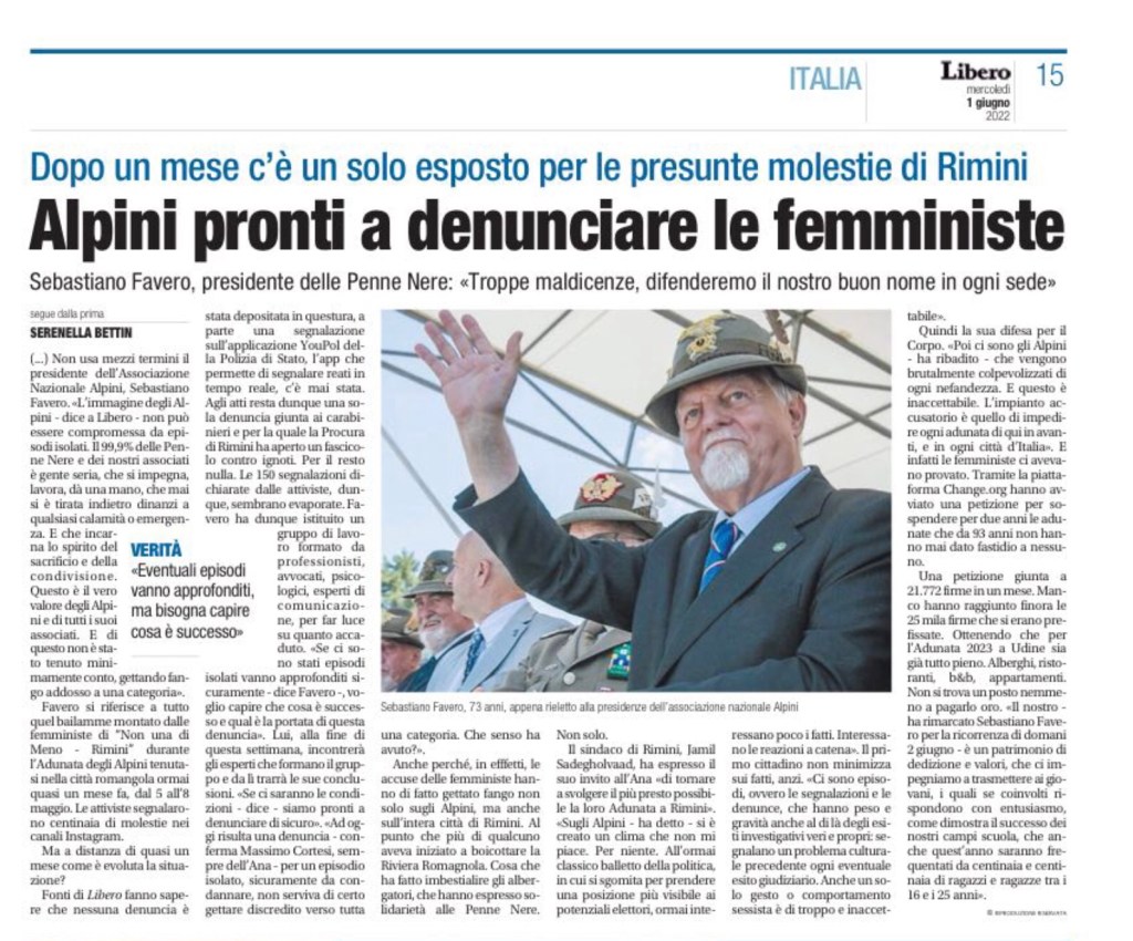 Favero si riferisce a tutto quel bailamme montato ad arte dalle femministe di “Non una di Meno Rimini” durante l’Adunata degli Alpini tenutasi ormai quasi un mese fa, dal 5 all’8 maggio. Le attiviste avevano segnalato centinaia di molestie nei canali Instagram.