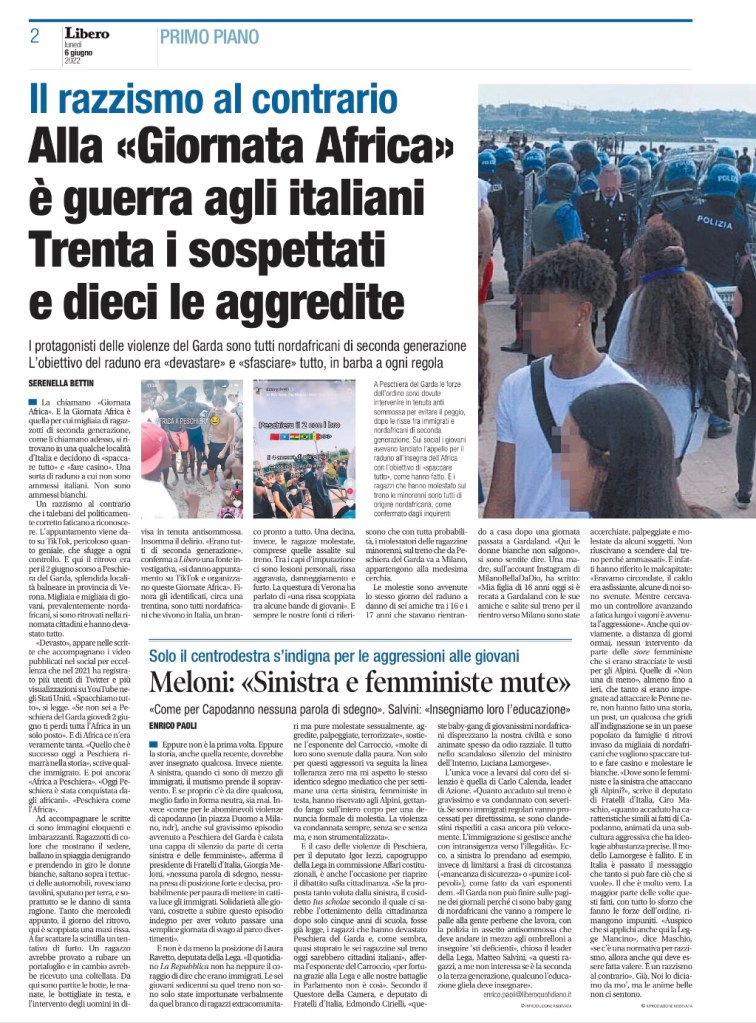 “Devasto”, appare nelle scritte che accompagnano i video pubblicati nel social per eccellenza che nel 2021 ha registrato più utenti di Twitter e più visualizzazioni su YouTube negli Stati Uniti. «Spacchiamo tutto», si legge. «Se non sei a Peschiera del Garda giovedì 2 giugno ti perdi tutta l’Africa in un solo posto». E di Africa ce n’era veramente tanta. «Quello che è successo oggi a Peschiera rimarrà nella storia», scrive qualche immigrato. E poi ancora: «Africa a Peschiera». “Oggi Peschiera è stata conquistata dagli africani”. Peschiera come l’Africa”. Ad accompagnare le scritte ci sono immagini eloquenti e imbarazzanti. Ragazzotti di colore che mostrano il sedere, ballano in spiaggia denigrando e prendendo in giro le donne bianche, saltano sopra i tettucci delle automobili, rovesciano tavolini, sputano per terra, e soprattutto se le danno di santa ragione. Tanto che mercoledì appunto, il giorno del ritrovo, qui è scoppiata una maxi rissa.