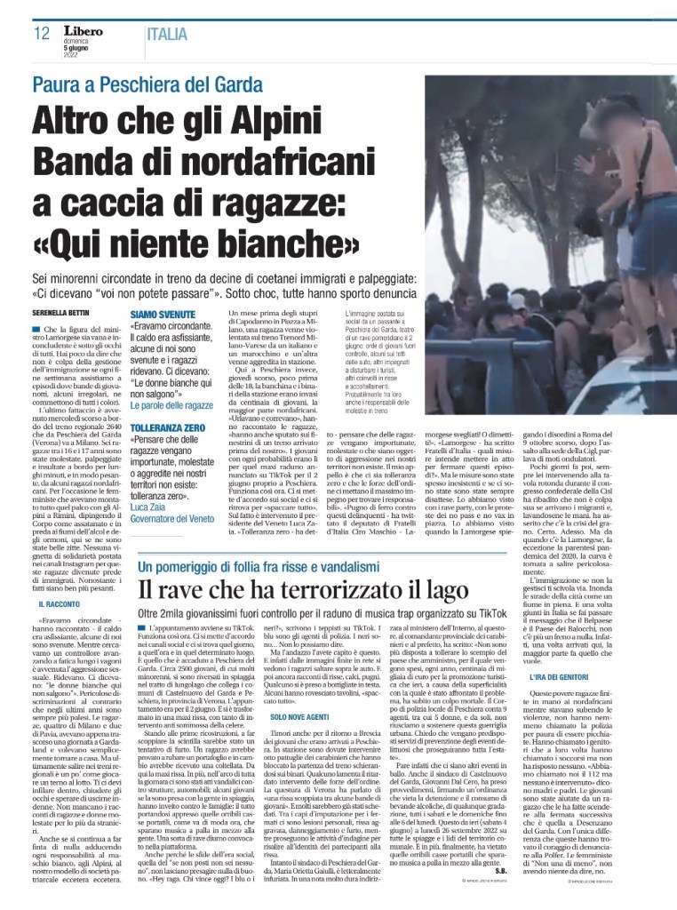 L’ultimo fattaccio è avvenuto mercoledì scorso a bordo del treno regionale 2640 che da Peschiera del Garda (Verona) va a Milano. Sei ragazze trai 16 e i 17 anni sono state molestate, palpeggiate e insultate a bordo per lunghi minuti, e in modo pesante, da alcuni ragazzi nordafricani.