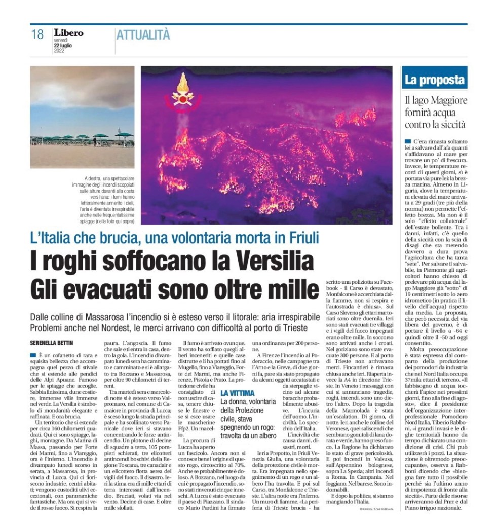 In Veneto i messaggi con cui si annunciano tragedie, roghi, incendi, sono uno dietro l’altro. Dopo la tragedia della Marmolada è stata un’escalation. Di giorno, di notte. Ieri anche le colline del Veronese, quei saliscendi che sembrano gomitoli di lana dorata e verde, hanno preso fuoco. La Regione ha dichiarato lo stato di grave pericolosità. E poi incendi in Valsusa, sull’Appennino bolognese, sopra La Spezia; altri incendi a Roma. In Campania. Nel foggiano. Nel barese. Sono indomabili. E dopo la politica, si stanno mangiando l’Italia.