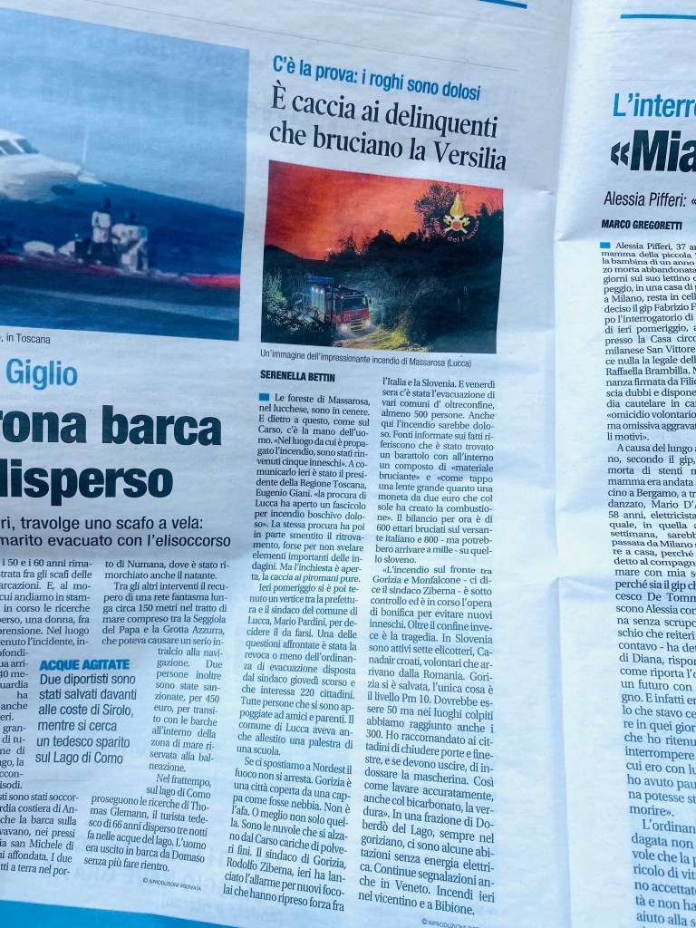 Il rogo che da lunedì ha bruciato quasi mille ettari di bosco sulle colline fra Massarosa e Camaiore sarebbe stato provocato volontariamente dalla mano dell’uomo.A comunicarlo ieri il presidente della Regione Toscana, Eugenio Giani. “Le immagini delle foreste di Massarosa in cenere sono strazianti – ha scritto su Facebook – L’ estate si preannuncia rovente per il rischio incendi al quale si aggiunge la follia dell’uomo: sono stati trovati inneschi e la procura di Lucca ha aperto un fascicolo per incendio boschivo doloso”. Ieri pomeriggio era in corso il vertice tra la prefettura e il sindaco del comune di Lucca, Mario Pardini, per decidere il da farsi. Una delle questioni affrontate è stata la revoca o meno dell’ordinanza di evacuazione disposta dal sindaco giovedì scorso e che interessa 220 cittadini. Tutte persone che si sono appoggiate ad amici e parenti. Il comune di Lucca aveva anche allestito una palestra di una scuola. “Abbiamo predisposto nelle frazione evacuate presidi di polizia municipale – ci dice Pardini – per scongiurare atti di sciacallaggio”. Se ci spostiamo a Nordest il fuoco non si arresta.