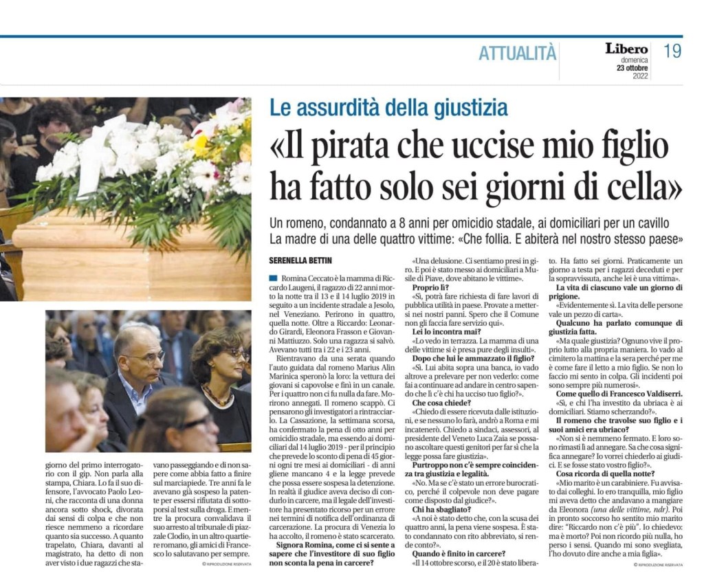 Romina Ceccato è la mamma di Riccardo Laugeni, il ragazzo di 22 anni morto la notte tra il 13 e il 14 luglio 2019, in seguito a un incidente stradale a Jesolo, nel veneziano. Morirono in quattro quella notte. Oltre a Riccardo: Leonardo Girardi, Eleonora Frasson e Giovanni Mattiuzzo. Solo una ragazza si salvò. Avevano tutti tra i 22 e i 23 anni.Rientravano da una serata quando l’auto guidata dal romeno Marius Alin Marinica speronò la loro vettura. L’auto dei giovani si capovolse e finì in un canale. Per i quattro non ci fu nulla da fare. Morirono annegati. Il romeno scappò. Ci pensarono gli investigatori a rintracciarlo. La Cassazione la settimana scorsa ha confermato la pena di otto anni per omicidio stradale ma essendo ai domiciliari dal 14 luglio 2019 – per il principio che prevede lo sconto di pena di 45 giorni ogni tre mesi ai domiciliari – di anni gliene mancano 4 e la legge prevede che possa essere sospesa la carcerazione. Il giudice aveva deciso di condurlo in carcere, ma il legale dell’investitore ha presentato ricorso per un errore nei termini di notifica dell’ordinanza di carcerazione. La procura di Venezia lo ha accolto e il romeno è stato scarcerato.