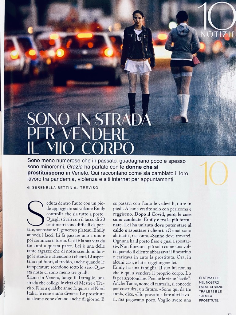 Lei è una delle tante ragazze che di notte scendono lungo le strade e attendono i clienti. Li aspettano qui, fuori al freddo. Anche quando le temperature scendono sotto lo zero. La notte che la raggiungiamo ci sono meno tre gradi. Siamo in Veneto, lungo il Terraglio, una strada che collega le città di Mestre e Treviso. Fino a qualche anno fa nel Nord Italia le cose erano diverse. Le prostitute in alcune zone c’erano anche di giorno. E se passavi con l’auto le vedevi lì, tutte in piedi. Una a una. Alcune svestite e vestite solo di perizoma e reggiseno. Dopo il covid le cose sono cambiate.