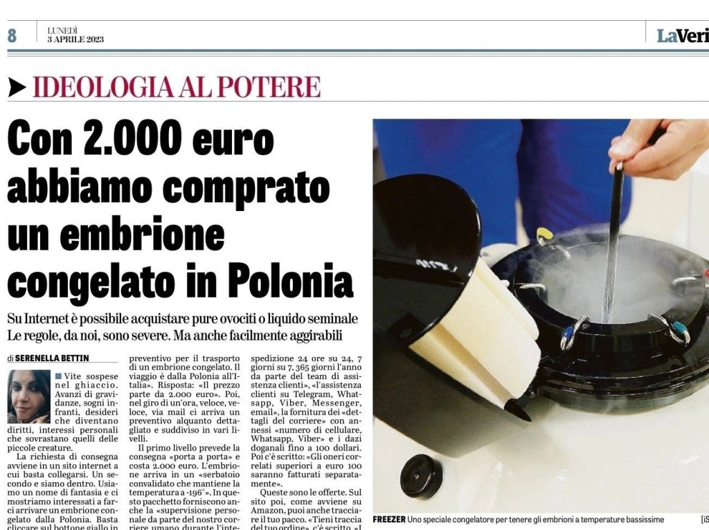 Ordinare il trasporto di un embrione, ammesso sia una pratica consentita, è facile come prenotare un mobile all’Ikea. Lo puoi comporre, scomporre, scegliere il tipo di viaggio, puoi decidere anche se vuoi un book fotografico. Il sito è quello di una società che ha sede negli Stati Uniti ed è specializzata in criotrasporti per la riproduzione assistita. Non è l’unica. “Trasportiamo cellule riproduttive umane – ci scrive il nostro interlocutore – per cliniche della fertilità e singoli pazienti con fecondazione in vitro, sia che tu debba trasportare ovociti congelati, campioni di sperma o embrioni”. L’evento della nascita, della vita che esplode, diventa un mercato, una forma di shopping, coordinato da specie di agenzia viaggi con tanto di all inclusive. Se desideri avere altre informazioni, in basso a destra del sito si apre una finestrella. “Benvenuto”, ti scrivono, “scrivici la tua mail e il tuo nome”. Da lì parte una conversazione con un operatore. Chiediamo quanto costi far arrivare un embrione congelato dalla Polonia all’Italia. “I need a quote for the transport of a frozen embryo. The journey is from Poland to Italy – Avrei bisogno di un preventivo per il trasporto di un embrione congelato. Il viaggio è dalla Polonia all’Italia”. “The price starts from 2.000 euros – il prezzo parte da 2000 euro”, ci risponde l’assistente. Poi, nel giro di un’ora, veloce, veloce, via mail ci arriva un preventivo alquanto dettagliato e suddiviso in vari livelli.