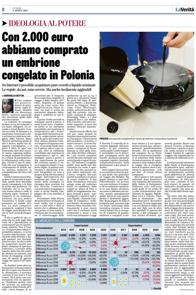 Una relazione del ministero della Salute al Parlamento (febbraio 2021 sull’anno 2018) parla di un arrivo di “3.060 criocontenitori provenienti da Spagna, Repubblica Ceca e Grecia”. Paesi dove la “donazione” – che donazione non è – di ovociti è ammessa. Se una coppia gay o se una donna in Italia non può aver figli, non fa altro che mandare lo sperma del marito o del compagno in una clinica all’estero, qui troverà qualche donna che donerà l’ovocita, si formerà l’embrione e questo in qualche modo tornerà in Italia, magari tramite le “agenzie viaggio” che organizzano last minute di embrioni in volo. La relazione del ministero della Salute al Parlamento, di settembre 2022, sull’attività dei centri di procreazione medicalmente assistita parla addirittura di “attività di import – export di gameti ed embrioni”. Sì. Dice proprio così. “Attività di import export di gameti ed embrioni”. Parole da far rizzare i capelli. Che sono anche il titolo dell’ultimo capitolo. Nel 2020, dati alla mano, quelli crioconservati erano 42.057 con una percentuale del 57,5% dei trasferibili e dei sopravvissuti. Da una tabella si legge che le importazioni di embrioni nei criocontenitori nel 2016 sono state 2.865. Nel 2018 arrivano a 3.060. E nel 2020, arrivano a 3989. Non solo. Da un documento di Camera e Senato scopriamo che nel 2018 “sono stati formati 98.673 embrioni trasferibili, ne sono stati trasferiti 54.725 (55,5%) e ne sono stati crioconservati 43.946 corrispondenti al 44,5%”. Nel 2020 invece “sono stati formati 74.871 embrioni trasferibili, ne sono stati trasferiti 32.339 (43,2%) e ne sono stati crioconservati 42.532 corrispondenti al 56,8% dei formati e trasferibili totali”. Embrioni che non possono essere distrutti. A fronte di questi dati le nostre fonti parlamentari parlano di un numero che si aggirerebbe oltre i 120 mila embrioni crioconservati totali, a cui vanno aggiunti quelli importati dall’estero.