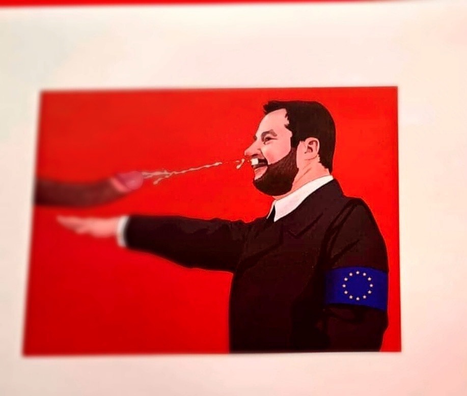 Io davvero non so cosa sarebbe accaduto se al posto della vignetta raffigurante un Salvini che fa il saluto romano e che viene sborrato in faccia dal membro di un ragazzo di colore, ci fosse stato un esponente del Pd o della sinistra o magari la neodiva magica Elly, raffigurati mentre partecipano a un’orgia tra gay o lesbo o quant’altro. Anche perché non si capisce se tale vignetta voglia prendere in giro Matteo Salvini o il membro del ragazzo di colore che sborra.
