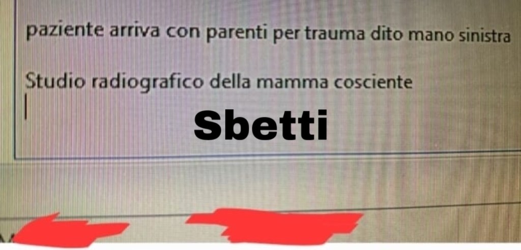 E cosa vuol dire: “Paziente esce dall’auto, un incidente di 4 ore, iniziato due ore fa con dolore al collo e nausea?”. E “studio radiografico della mamma cosciente”?
