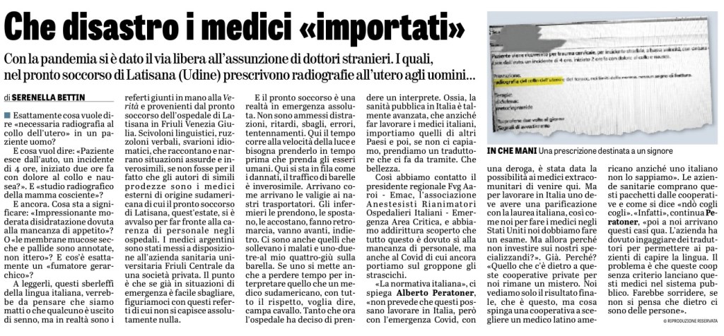 I medici argentini sono stati messi a disposizione all’azienda sanitaria universitaria Friuli Centrale da una società privata. Il punto è che se già in situazioni di emergenza è facile sbagliare, figuriamoci con questi referti di cui non si capisce assolutamente nulla.