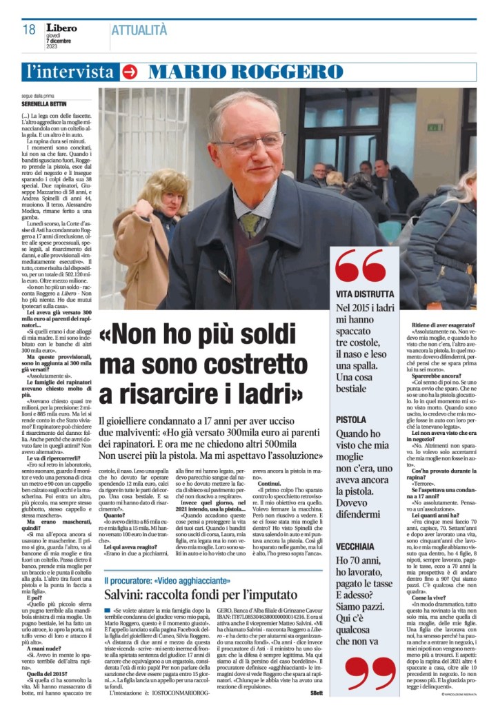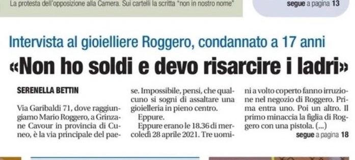 Via Garibaldi 71, dove raggiungiamo Mario Roggero, a Grinzane Cavour in provincia di Cuneo, è la via principale del paese. Impossibile, pensi, che qualcuno si sogni di assaltare una gioielleria in pieno centro. Eppure. Eppure erano le 18.36 di mercoledì 28 aprile 2021. Tre uomini a volto coperto fanno irruzione nel negozio di Roggero. Prima entra uno. Poi un altro. Il primo minaccia la figlia di Roggero con una pistola. La lega con delle fascette. L’altro aggredisce la moglie minacciandola con un coltello alla gola. E un altro è in auto. La rapina dura sei minuti. I momenti sono concitati, lui non sa che fare. Quando i banditi sgusciano fuori, Roggero prende la pistola, esce dal retro del negozio e li insegue sparando i colpi della sua 38 special. Due rapinatori, Giuseppe Mazzarino di 58 anni, e Andrea Spinelli di anni 44, muoiono. Il terzo, Alessandro Modica, rimane ferito a una gamba. Lunedì 4 dicembre scorso, la Corte d’assise di Asti ha condannato Roggero a 17 anni di reclusione, oltre alle spese processuali, spese legali, al risarcimento dei danni, e alle provvisionali “immediatamente esecutive”. Il tutto, come risulta dal dispositivo, per un totale di: 502.120 mila euro. Oltre mezzo milione. “Io non ho più un soldo – racconta Roggero a Libero – Non ho più niente. Ho due mutui ipotecari sulla casa”.
