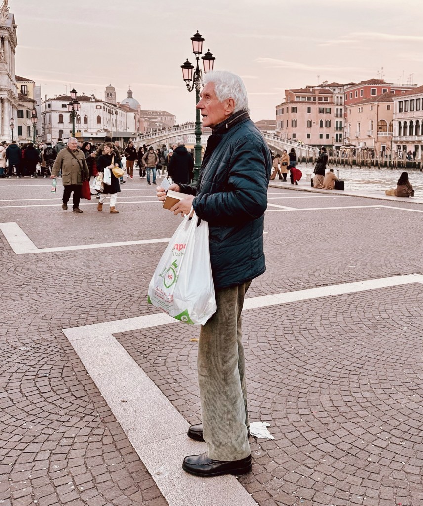 Lui mi ha guardato con due occhi sbalorditi come a dire: grazie di cosa, sono qui per questo. Grazie, che parola. Quante volte la diamo per scontata. Quante volte la pronunciamo a mezza bocca, come fosse un segnalibro che metti sempre al solito posto in un libro impolverato sopra il comodino, e quante volte non la diciamo, la diamo per assodata, e invece no, non è scontato niente. Un grazie si deve sempre. Grazie quando ti aprono la porta, quando fanno qualcosa per te, quando investono del tempo per starti appresso. Diciamo che quell’operatore me l’ero mangiato prima, ero sbroccata, la tensione, l’ansia, l’adrenalina, quando giri certi servizi hai una serie di sentimenti concentrati tutti insieme che un caleidoscopio in confronto ti sembra un mare calmo, tranquillo, poco mosso. E vengono fuori tutti insieme quei sentimenti, te li senti addosso, ti divorano, ti salgono le gambe, ti prendono la pancia, la gola, ti salgono fino alla bocca, gli occhi, la testa, il cuore. È qualcosa che ti invade, pervade, che ti sconvolge ed è come mettere la testa dentro al frullatore. Sconvolta, sconquassata, così com’ero, me la sono presa con lui, gli avevo detto parole che non merita. Ma quando fai un lavoro siete tutti nella stessa barca, nella stessa regata, nella stessa vela. Poi quando siamo risaliti, e percorrevamo quei ponti, e quelle calli, e quei campi – si chiamano così le piazze di Venezia – quando ci scostavamo da quel fiume di gente che ci veniva addosso, quando facevamo a bracciate per farci spazio tra la folla, in mezzo a quella nuova di gente che si muoveva come muove la spumiglia quando la metti sopra il nastro dal fornaio – ricorda che una nuvola non sa perché si muove in una certa direzione e a una certa velocità. Segue un impulso, è li che deve andare – ecco quando siamo risaliti, in mezzo al volo dei gabbiani, in mezzo agli albori della sera, al crepuscolo del tramonto, in mezzo al vocio della gente, gli ho detto: grazie. Poi quando mi sono girata, ho incrociato quest’uomo, c’avea un blocco tra le mani e annotava i suoi pensieri. Su di un foglio, una sola parola: grazie ancora.