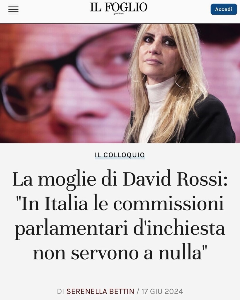 Quando incontro Antonella Tognazzi sono da poco arrivata a Termini. Antonella Tognazzi è la moglie di David Rossi, il capo della comunicazione della banca Monte dei Paschi di Siena, deceduto, dopo essere precipitato dalla finestra del suo ufficio, il 6 marzo 2013.