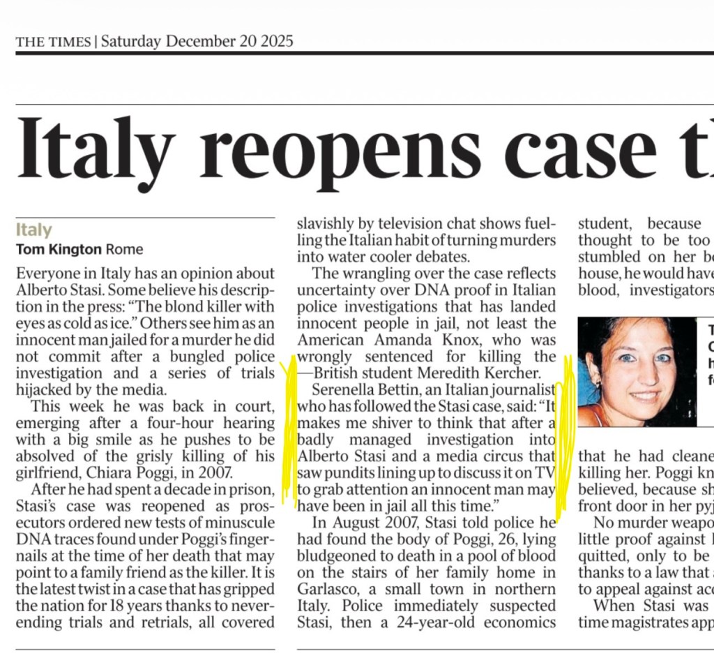 Qui sotto trovate la mia intervista sul Times. Mi ha chiamato Tom Kington, per commentare il caso Garlasco. Qui le mie parole. Ho detto che sta diventando un circo mediatico. E che rabbrividisco al pensiero che dinanzi a questo circo, ci possa essere un innocente in carcere. Come rabbrividisco al pensiero che dinanzi a questo circo ci sia una ragazza morta a cui più volte è stato mancato di rispetto. Oltre al fatto che ora, ho detto al giornalista, questo caso sta diventando una bandiera per giustificare il sì al prossimo referendum.